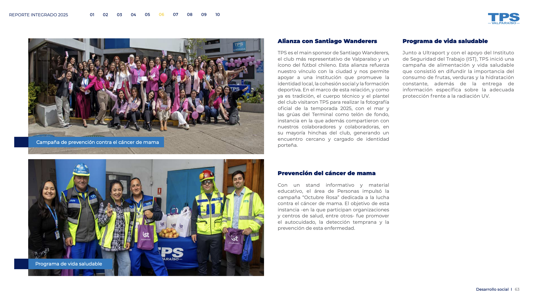 Algunas de las grandes cifras del Reporte Integrado 2025, que abarcó el vigésimo quinto aniversario de la concesión de TPS, incluyen 15 iniciativas del área de Personas, más de 10.000 horas de capacitación; más de 13.000 personas y 74 instituciones beneficiadas con los programas sociales, 1.400 visitas al Terminal y el 100% de la dotación capacitada en el Modelo de Prevención de Delitos, entre otros indicadores.