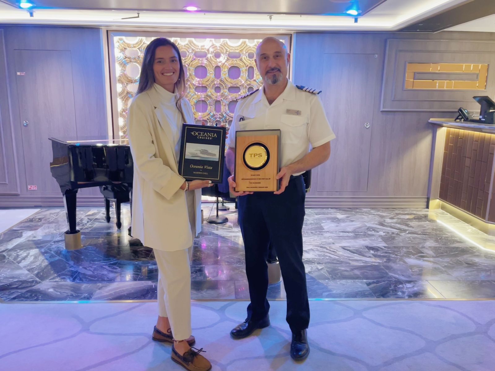 Como es tradicional en las recaladas inaugurales, una delegación de TPS recibió a los visitantes y la tripulación, oportunidad en que se entregó un galvano que conmemora el primer viaje de esta nave al Puerto de Valparaíso.
